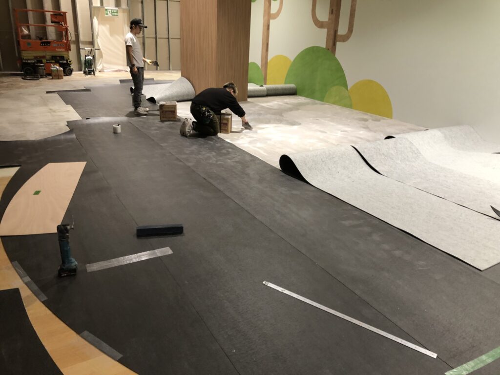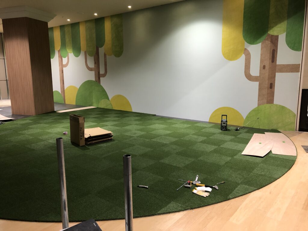 | 施工内容 | 仮囲い工事、解体工事、大工工事、クロス貼り工事、床芝生塩ビタイル貼り |